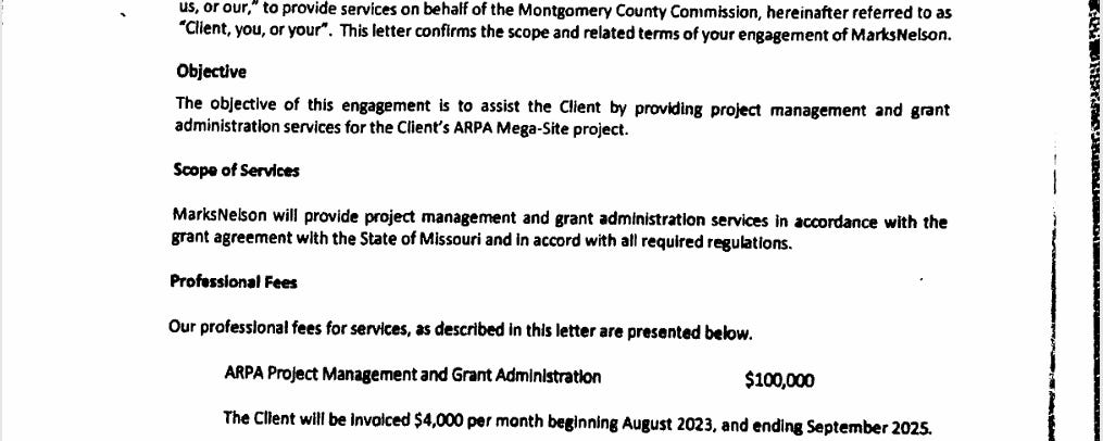 Now put this next to my FOIA documents. In 2023, Montgomery County signed an engagement letter with MarksNelson Advisory for: