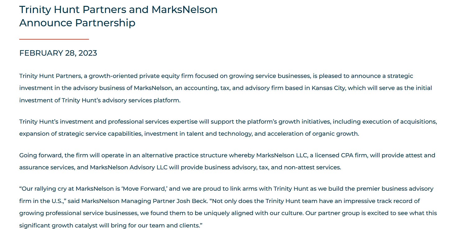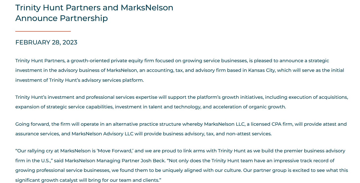Trinity Hunt and Springline’s own language confirms this. They talk openly about transforming the mid-market accounting industry, adding capabilities through acquisitions, and executing a buy-and-build strategy.