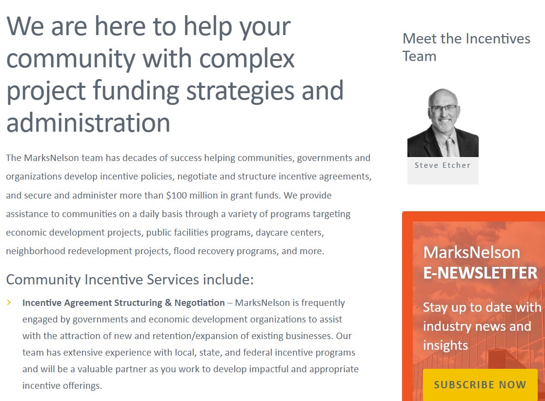 So even before private equity shows up, MarksNelson is sitting in a very powerful spot because they know where projects want to land (site selection). They know which communities are hungry enough to compete (economic development). They know how the federal and state money actually flows (grant administration).