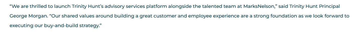 In 2023, Trinity Hunt invested in MarksNelson Advisory and announced that MarksNelson would be the anchor of a new advisory “platform.”